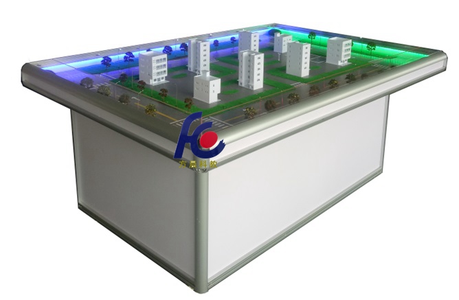 2.1城市智能實(shí)訓(xùn)系統(tǒng)沙盤(pán)面積2.0米x1.4米、 離地面高度0.7m,上面有安裝城市交通系統(tǒng),停車(chē)場(chǎng),建筑模型,路燈系統(tǒng),提示牌、大樓供電系統(tǒng)、巡邏系統(tǒng)、周界系統(tǒng)、監(jiān)控系統(tǒng)等,路面上鋪設(shè)車(chē)輛導(dǎo)航色帶和RFID標(biāo)簽。城市交通系統(tǒng)由行車(chē)道、交通燈、交通指示牌、提示牌、信息顯示屏等組成;停車(chē)場(chǎng)由入出口道閘、停車(chē)區(qū)、車(chē)輛信息顯示屏等組成;建筑模型包括樓宇、廠房、路燈、公共綠地等模型。